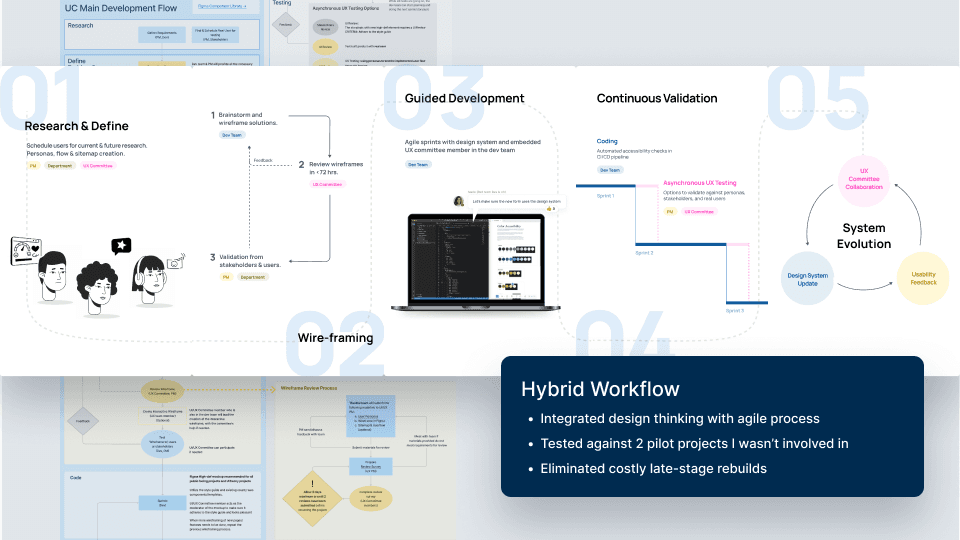 We replaced the rigid waterfall process with an agile workflow that integrated design thinking principles and asynchronous UX testing, eliminating late-stage rebuilds.