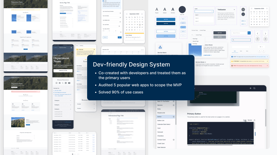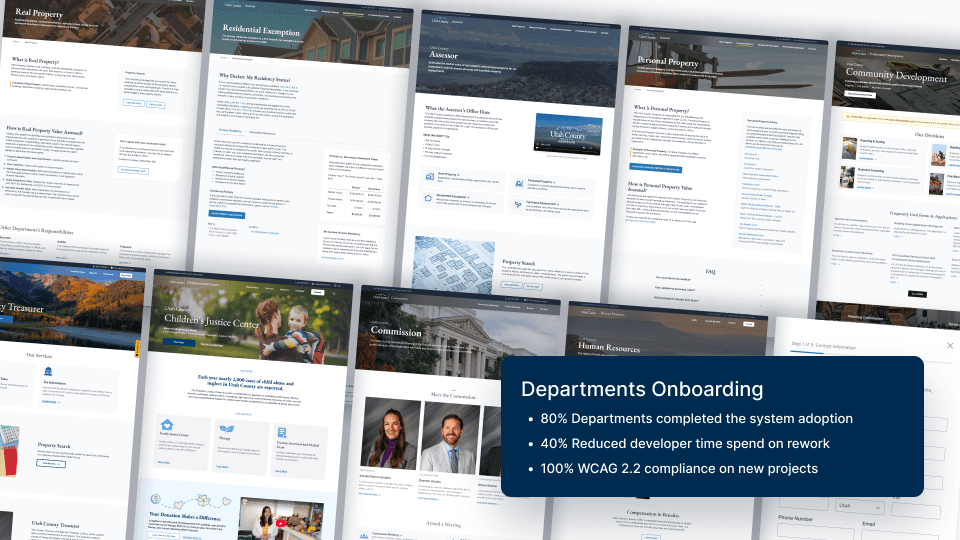 I led the creation and expansion of Utah County's design system, using it as a tool to restructure government workflow. By implementing a federated governance model, I removed the friction between departments and developers. The result was a 150% increase in service usage, 3.3 million in IT budget secured, and two NACo awards.